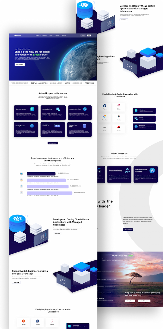 A website designed for a cloud hosting provider, similar to DigitalOcean. It features detailed service descriptions, pricing plans, and customer support integration, offering businesses scalable cloud solutions.