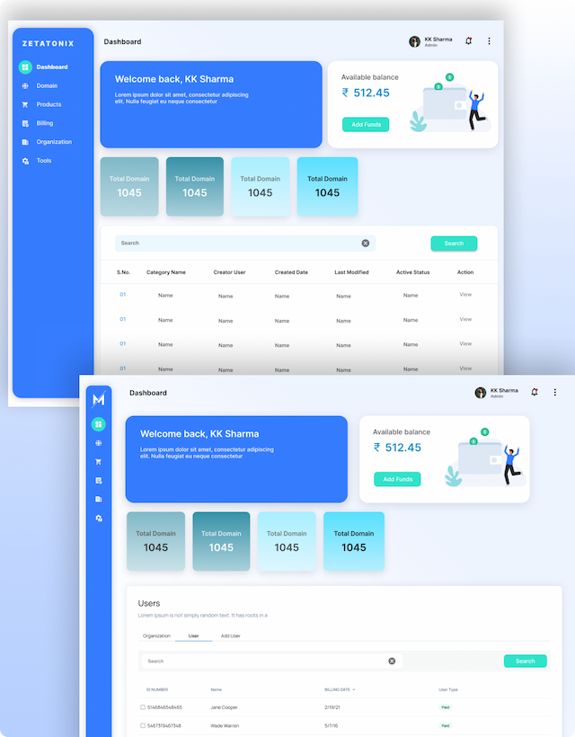 A robust dashboard built for hosting providers to efficiently manage domain registrations, client accounts, and hosting plans. The interface provides real-time analytics, user management, and easy access to hosting services, streamlining the entire registrar process